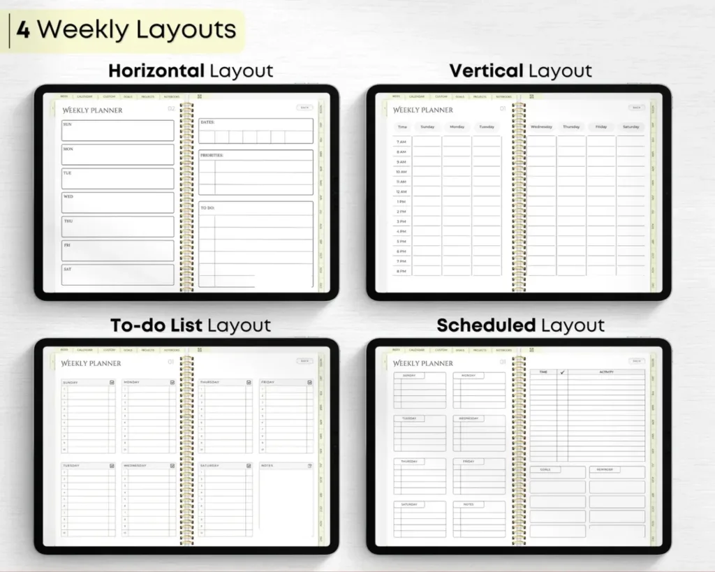 ✔ 4 Weekly Planner Layout options (Boxed, Horizontal, Vertical & Scheduled)